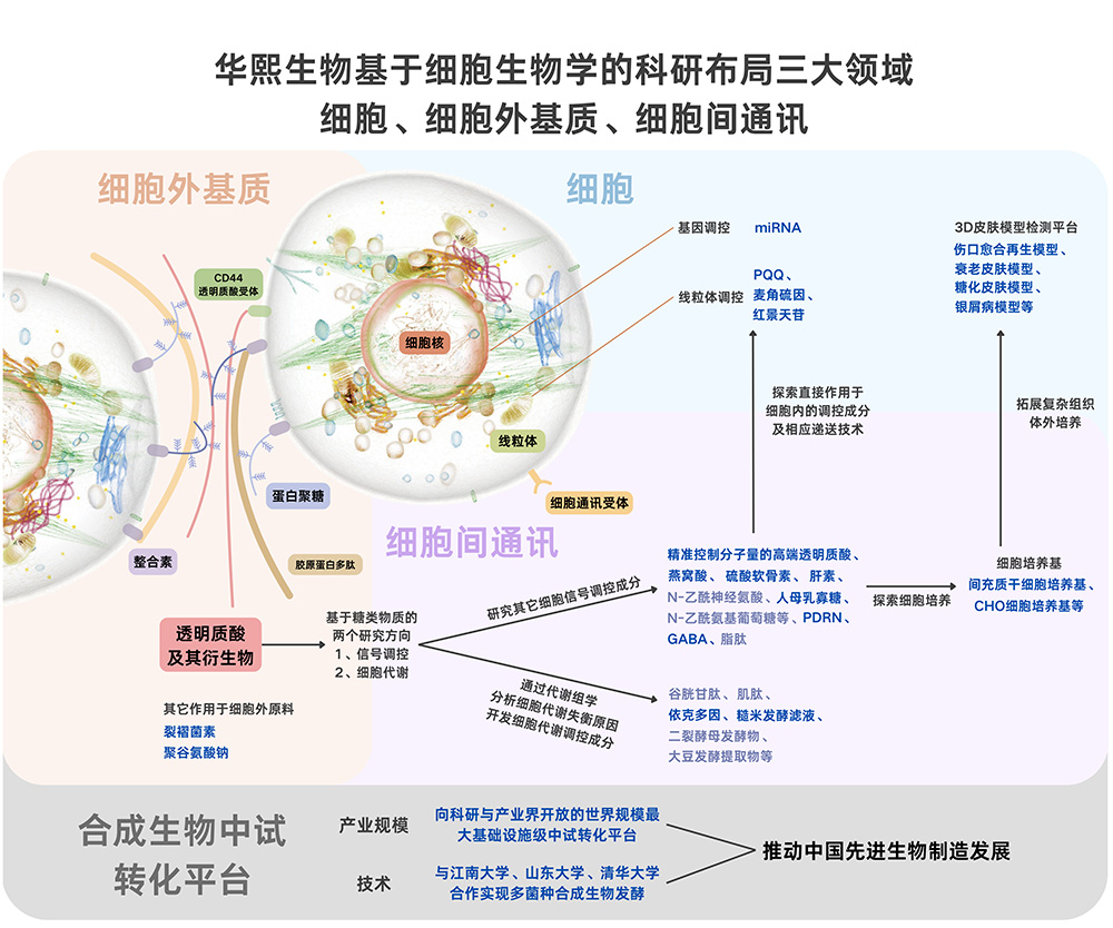 华熙生物在掌握精准分子量控制的高端透明质酸技术后,运用与全球大学、研究机构、药企的合作机会,积极开展逆向研究,由此打开了细胞生物学、糖生物学在衰老干预、组织再生等领域的前沿研究窗口。基于糖类物质在细胞分化与信号机制中的关键作用,华熙生物的研究范围从透明质酸所在的细胞外基质(ECM),延伸至细胞间通讯和细胞本身,构成了研发布局的三大核心板块。